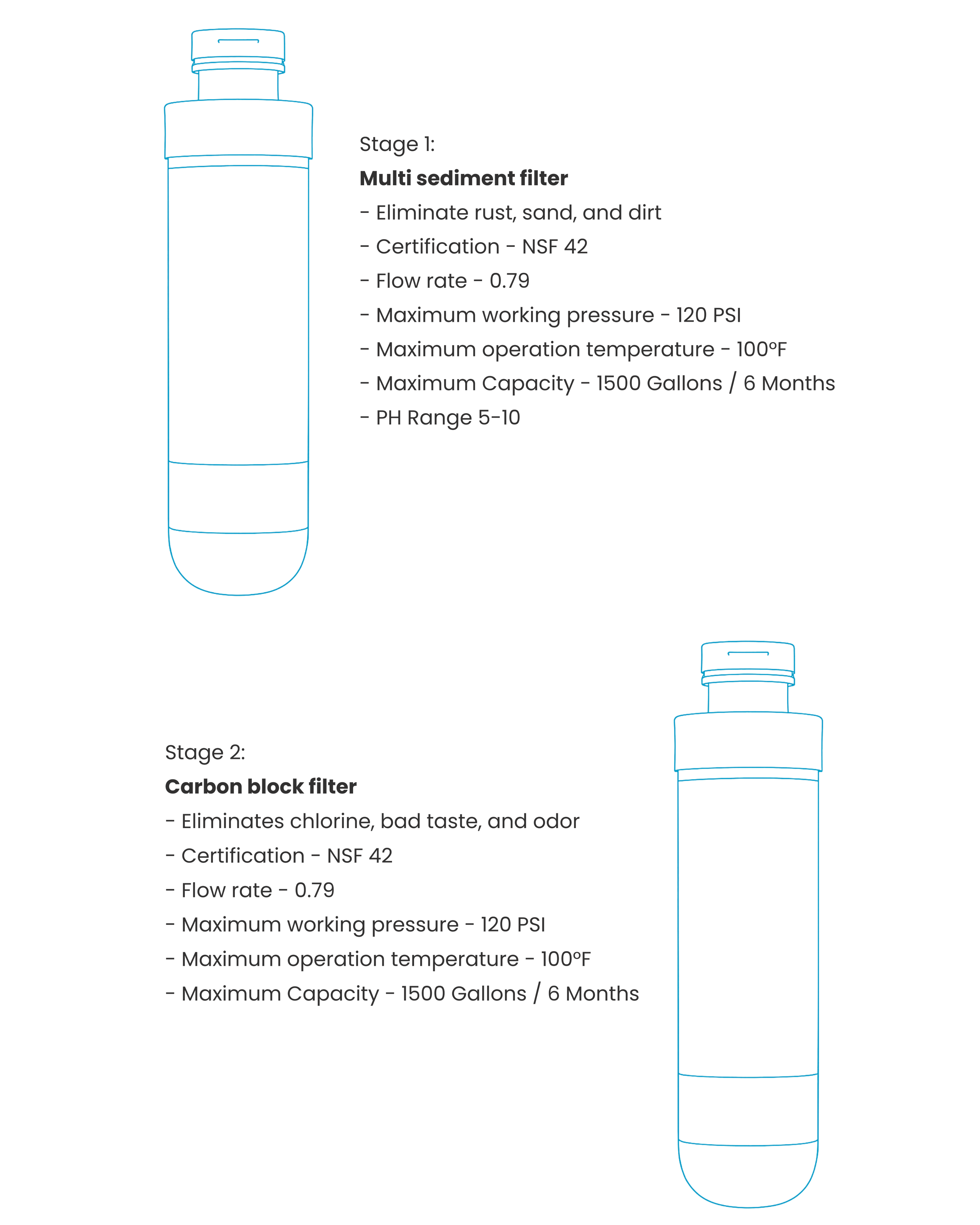 Aquifer+ dual-stage filtration delivers crisp, great-tasting water. Our Stage 1, Multi-Layer Sediment Filter captures rust, dirt, sand, and other fine particles. Mean while the Stage 2 Carbon Block Filter reduces chlorine, unpleasant tastes, odors, and a range of impurities for a cleaner, fresher taste. Both filters are rigorously tested and certified under NSF 42 and NSF/ANSI/CAN 372 standards, ensuring that every drop meets the highest public health and safety benchmarks. Our set will provide clean fresh tasting water, for up to 1500 gallons or 6 months.