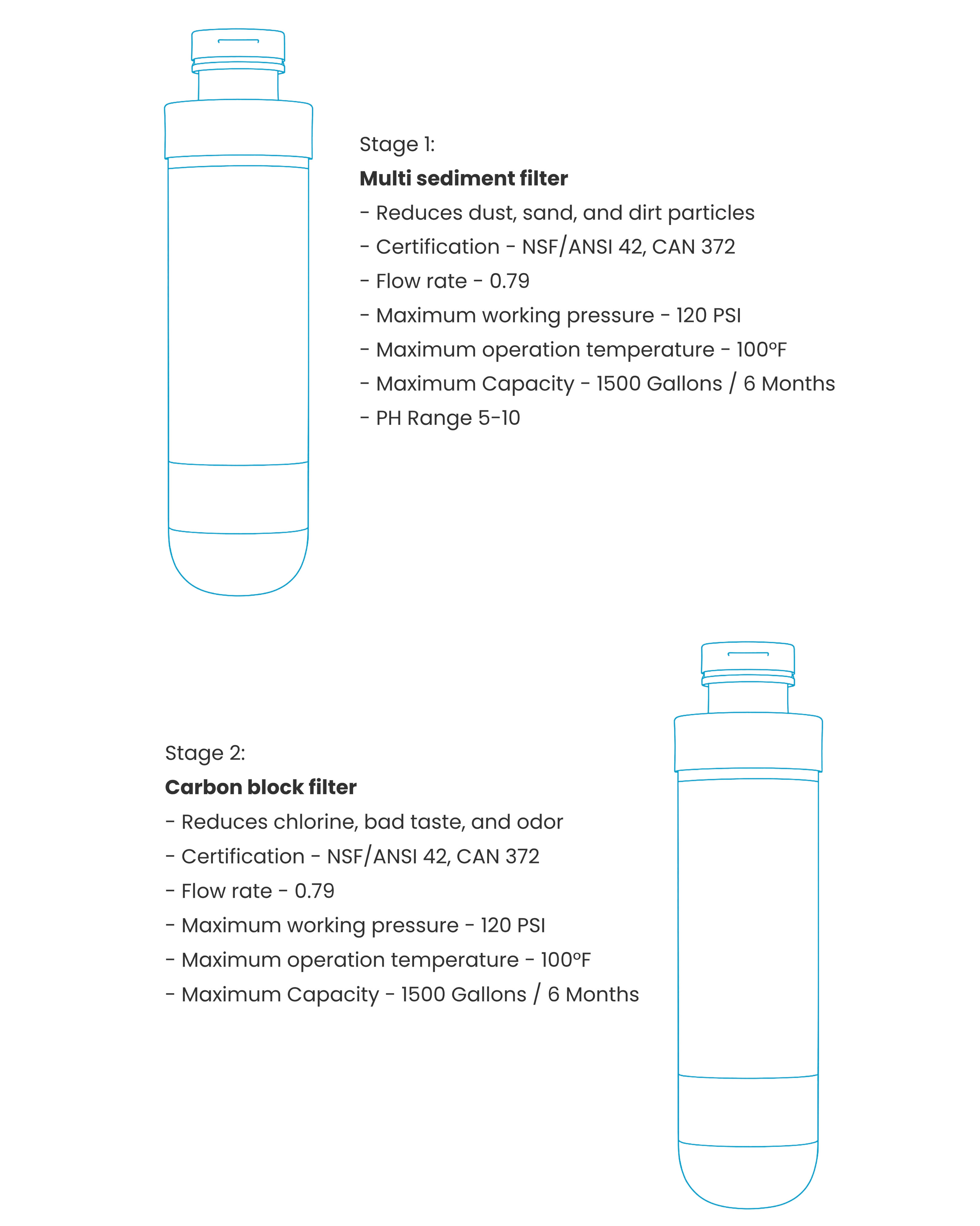Aquifer+ dual-stage filtration delivers crisp, great-tasting water. Our Stage 1, Multi-Layer Sediment Filter captures rust, dirt, sand, and other fine particles. Mean while the Stage 2 Carbon Block Filter reduces chlorine, unpleasant tastes, odors, and a range of impurities for a refined taste. Both filters are rigorously tested and certified under NSF 42 and NSF/ANSI/CAN 372 standards, helping deliver great-tasting water from lead-free materials. Our set will provide clean fresh tasting water, for up to 1500 gallons or 6 months.